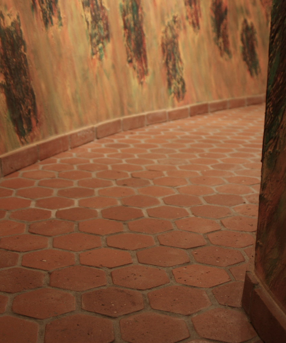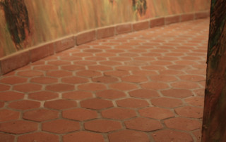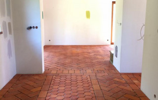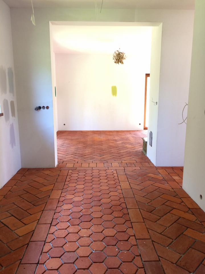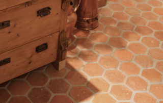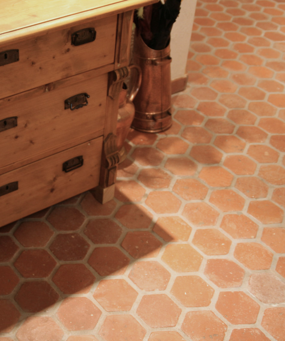 Carreaux en terre cuite pour le sol, aux couleurs naturelles et chaudes du cotto et à la texture légèrement variée et unique.